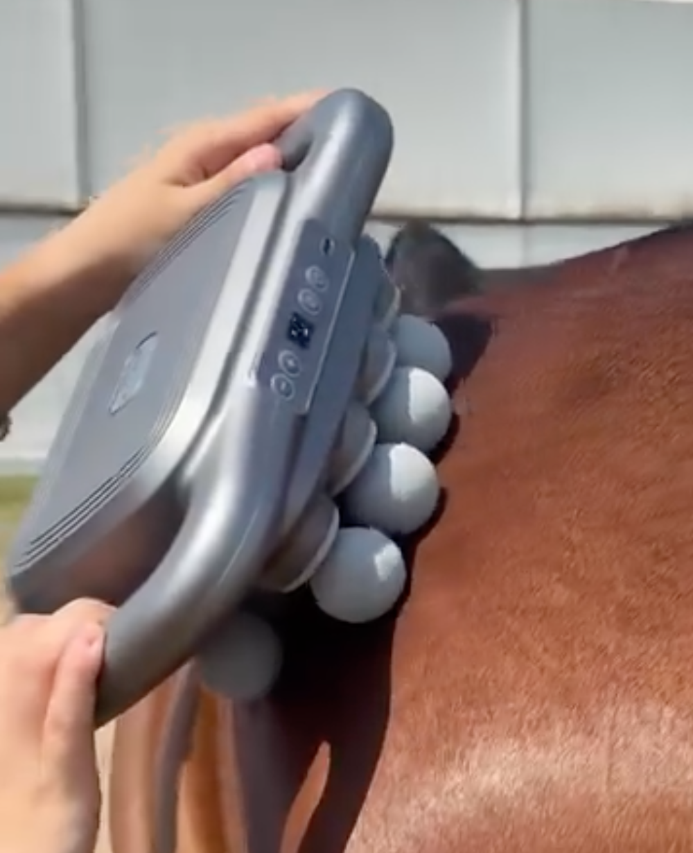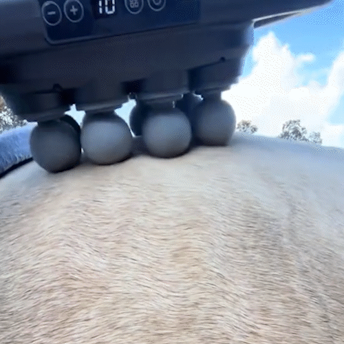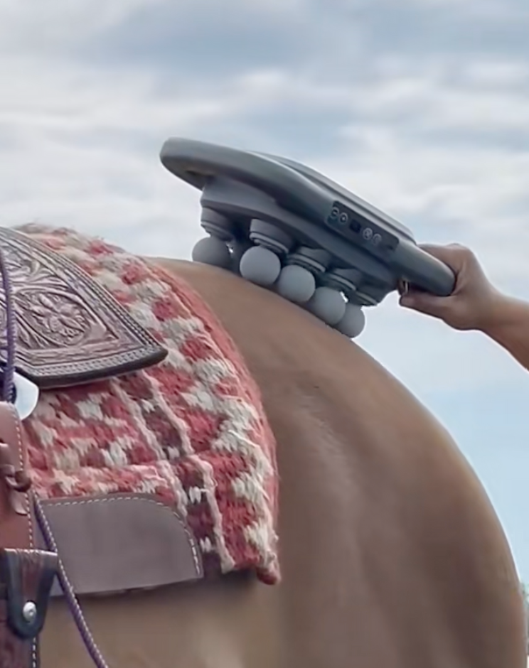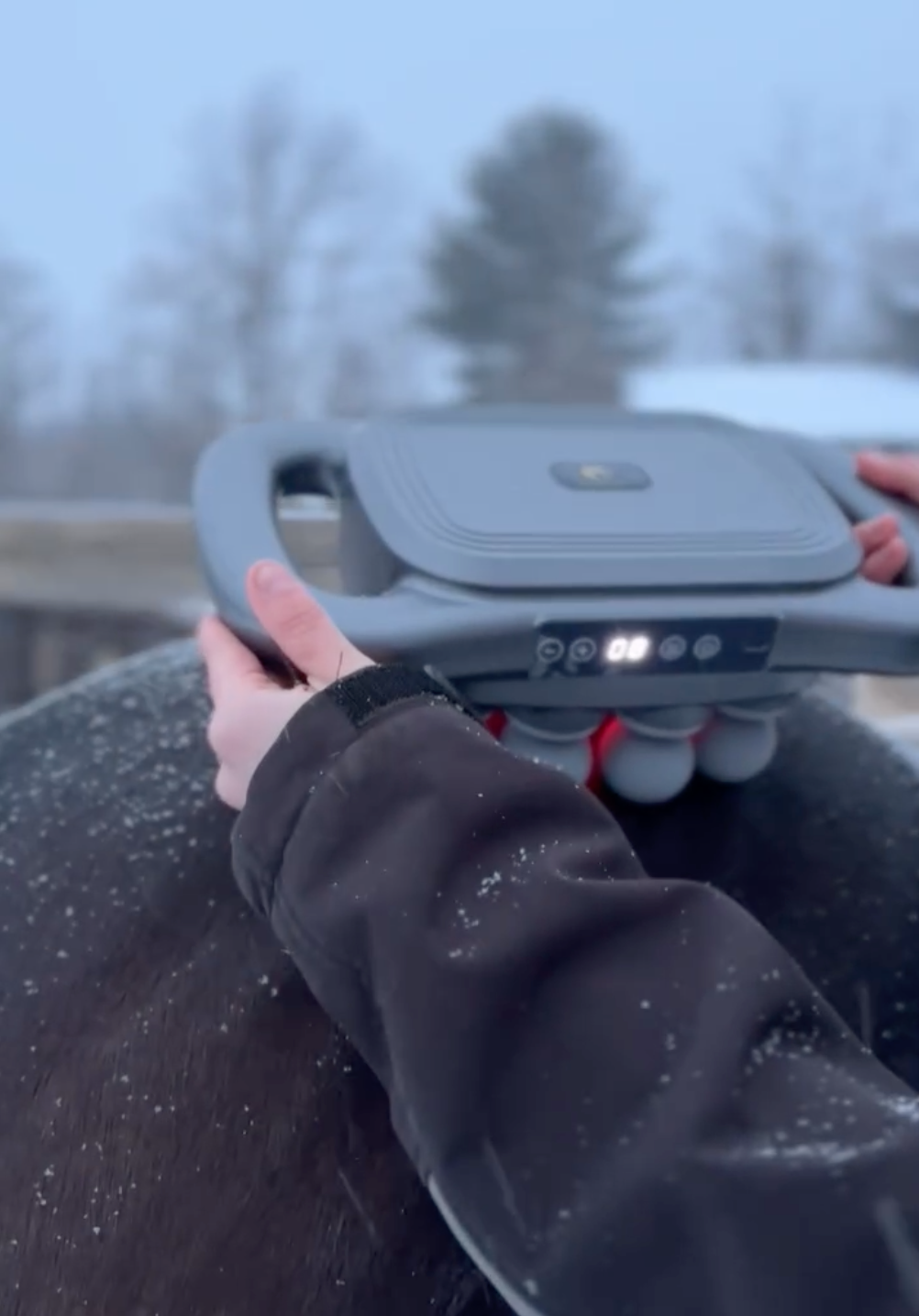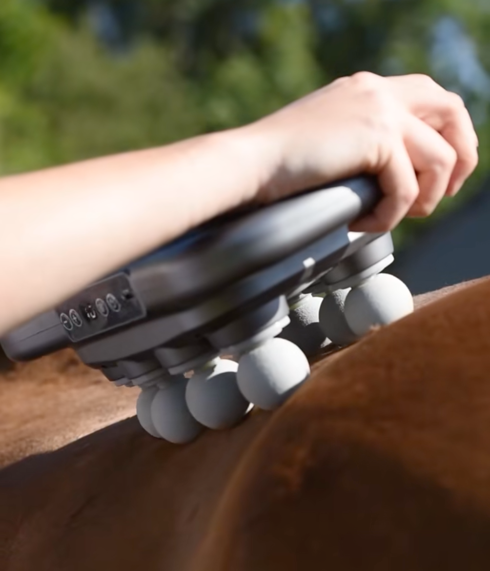 Posez simplement l'appareil et guidez-le. Vous n'avez pas besoin de "pousser" ou d'appuyer sur le cheval. Le poids de l'appareil suffit à appliquer la pression nécessaire sur les grosses masses musculaires (fessiers, dos).
