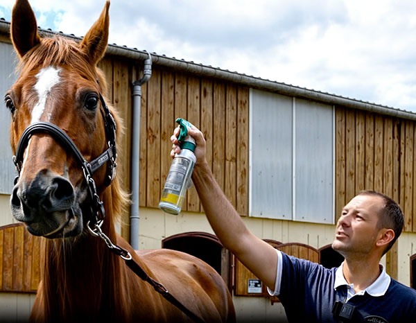 Pulvériser environ 8 fois de chaque coté du cheval, en évitant le nez, les yeux, les lèvres et l’intérieur des oreilles. Répartir sur le poil à l’aide d’un gant ou d’une brosse.